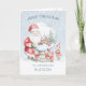 Farbenfrohe Weihnachtskarte für deinen kleinen Sohn. Santa mit kleinen Helfern lächeln mit Freude an der Schneeszene und wünschen allen Kindern frohe Weihnachten.