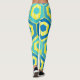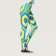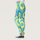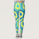 Diese Leggings haben ein geometrisches Design von Sechsecken in vier Blautönen auf einem Gelbstreifen in zwei Farbtönen.