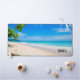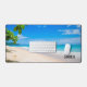 Schreibtischmatte mit einem schönen Foto. Ein weißer Sandstrand mit blauem Wasser. Entspannendes Bild mit sonniger Luft und sanftes, schäumendes Surfen mit niedlichen tropischen Blätter, die das Bild umrahmen.