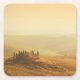 Untersetzer mit einem Sonnenaufgang über dem berühmten Podere IL Belvederelandhaus in einer Landschaft mit unfruchtbarem, Rolling Hills im Val d'Orcia in Toskana, Italien.