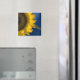 Die hübsche Sonnenblume auf Blue Magnet macht großen Kühlschrank oder das Filmen von Schrankkunst für einen Blume Liebhaber, Gärtner oder Floristen. Dieser elegante Sonnenblumenmagnet zeichnet sich durch ein nahes Makronaturfoto aus, das eine gelbe Sonnenblume und ein grünes Blatt auf blauem Hintergrund zeigt.