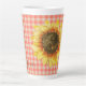 Die bezaubernde Kaffee-Tasse im Landhausstil mit Gingham Karo-Hintergrund und großer Sonnenblumenblüte im Wasser