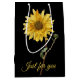 Reizende Geschenktasche getan im Schwarzen mit botanischer Grafik einer Sonnenblume. Gelber kundenspezifischer Text liest gerade für Sie, und kann personalisiert sein, zu lesen, was Sie wollen.