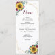 Diese eleganten Hochzeitsmenüs sind in einem floralen Aquarell-Design mit Sonnenblumen bordeauxfarbenen Rose und Imitaten goldenen geometrischen Rahmen. Personalisieren Sie den Text mit Ihren Namen und Ihrem Menü. Auch passende Produkte sind erhältlich.