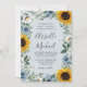 Das Design zeichnet sich durch einen staubigen, blau-grauen Kornhintergrund aus, mit einem Kranz aus Sonnenblumen, Gänseblumen, Rose in staubigen Blautönen, Babyatmen über verschiedene botanische Aquarellelemente.