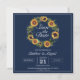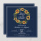 Elegante Hochzeit Save the Date mit einem wunderschönen Sonnenblumenkranz und marineblau. Personalisieren Sie es mit einem QR-Code auf der Rückseite, dass Ihre Gäste scannen können, um einfach Ihre Hochzeitswebsite zu öffnen.