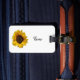 Das Sonnenblumengepäcksschild kann mit Ihrem Namen oder einem Sprichwort personalisiert werden. Auf der Rückseite fügen Sie Ihre Informationen für den Fall, dass Ihr Gepäck verloren ist.