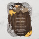 Rustikale Blumen-Hochzeitseinladung mit Sonnenblumen und Burlherzen vor einem Stallholzhintergrund mit weißem Blumengeflecht und Lichtern an der Saite. Das perfekte Kartendesign für die Einladung in Ihr rustikales Land, Ihren Garten, Hinterhof oder die Scheune Hochzeitsfeier, die von Blume mit Sonnenblumen inspiriert wird.