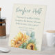 Dieses Schild für ein Babyduschspiel beinhaltet Aquarellsonnenblumen und Eukalyptus-Blätter, Schrift und klassische Serifentypografie.