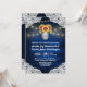 Sonnenblumen Mason Jar Probe Dinner Einladungen - mit einem königlichen oder blauen Stallholz Hintergrund bestickt mit Spitzen und mit warmen Streichelleuchten dekoriert. Das Design umfasst auch einen Blumenstrauß in einem Glaskeramikglas, mit dem Sie die Initialen Ihrer Wahl anpassen können. Die Rückseite hat auch den gleichen rustikalen Hintergrund, um die Vorderseite.