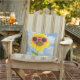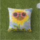 Rosa Sonnenbrille auf Sonnenblumen im Feld der Sonnenblumen mit Sommerhimmel Hintergrund. Die Rückseite des Kissens ist gesteppt gelber Gingham. Das Quiltmuster wird digital gerendert.