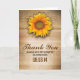 Hochzeitsdankkarte mit Sonnenblumenblüte und rustikalem Holzhintergrund.