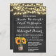 Sonnenblume-Tafel-Proben-Abendessen-Einladungen - kennzeichnen Sie Schnurlichter und ein Maurerglas, das mit Leinwand und Spitze, die, verziert wird mit Sonnenblumen über einem Tafelhintergrund gefüllt wird. Sehen Sie die gesamte zusammenpassende Sammlung in diesem Entwurf unten.