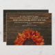 Eine Hochzeitseinladung, die ein Bild einer orange Sonnenblume späht von der Unterseite über einem Hintergrund von dunkles Braun barnwood kennzeichnet. Personifizieren Sie den Text mit Details Ihrer Gelegenheit.