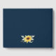 Das Design zeichnet sich durch Aquarellgrün, Sonnenblumen, bedruckte Goldelemente und luftige botanische Blätter über einen geometrisch bedruckten goldfarbenen Rahmen aus. Die Rückseite ist mit einem kleinen Blumenstrauß im Grünen und Sonnenblumen geschmückt. Alle Seiten haben einen dunkelmarineblau blauen Hintergrund.