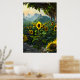 Wiese mit Sonnenblumen mit einem Wald mit klarem Himmel und der Sonne im Hintergrund. Das ist eine künstlerische KI.