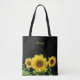 Sonnenblumen auf der schwarzen Tote Tasche. Text nur auf der Vorderseite.