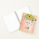 Ein Hintergrund mit orangefarbenem Verlauf. Mit Sonnenblumen, Eukalyptuspflanzen und goldenen Imitaten verzierten Glitzern dekoriert. Personalisieren und fügen Sie einen Titel und Namen hinzu. Schwarze Buchstaben. Der Name wird mit einem modernen handgeschriebenen Signaturstil geschrieben. Ein Notizbuch für Zeichnungen, Skizzen, Noten und Hausaufgaben in der Schule.