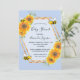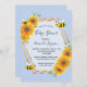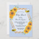 Elegante, lustige Baby Dusche Einladung, ein Baby Junge zu feiern. Ein hellblauer Hintergrund. Mit einem Imitat goldener geometrischer Rahmen. Gelbe, orangefarbene Sonnenblumen und glückliche Hummeln. Mit dem Text: Baby Shower und der Name der Mami auf der Vorderseite geschrieben mit einem modernen handgeschriebenen Stil Skript. Schwarze Buchstaben. Zurück: hellblauer Hintergrund und eine glückliche lächelnde Biene.