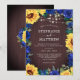 Diese rustikalen Einladungen für Hochzeitsfeiern sind mit einer blühenden Wasserlinie aus Sonnenblumen, blauen Rose, Blume und Blattwerk auf einem Holzboden mit leuchtenden Saitenlichtern versehen. Personalisieren Sie sie mit Ihrem eigenen Text. Besuchen Sie unseren Shop, um die ganze Palette von Artikeln zu sehen, die Sie für Ihre Hochzeit personalisieren können.