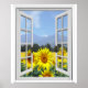 Sommerliche Sonnenblumen Blick auf den Garten, Fake Fensterlandschaft, für ein fensterloses Büro. Sehr realistisches Landschaftsoptik-Illusionsplakat, das gut auf einem Büro oder einer Studentenwand aussehen würde.
