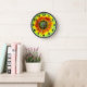 Dieses niedliche Blumendesign im Sommer hat eine kühne Sonnenblumenblüte in voller Blüte. Es ist in hellgelben, lebhaften Orange- und Brauntönen und Grün gehalten, auf einem leicht bedrückten/grunen sommerlichen Hintergrund. Die große Blume hat ein gemaltes Aussehen. Wenn Sie Gärten und blühende Motive Liebe geben, werden Sie die lebendige, sonnige Blume dieses Landes im Sommer inspiriertes Design Liebe. Die Uhrennummern sind schwarz.