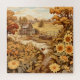 Puzzle mit dem Gemälde eines alten Bauernhofs im Land mit hellgelben Sonnenblumen und farbenfrohen Herbstblättern.