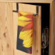 Lassen Sie den Tag mit diesem wunderschönen Handtuch ausklingen. Drei wunderschön farbene Sonnenblumen strahlen in beleuchteter Hintergrundbeleuchtung durch das Sonnenlicht, das durch die Blätter strömt. Die Blume sind mit goldfarbenen, gelben, orangen, roten und braunen Farbtönen gestaltet. Der blaue Himmel vervollständigt diese abstrakte Komposition von Farbe und Form.