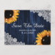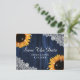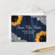 Eine maßgeschneiderte rustikale Hochzeit mit Marineblau und Sonnenblumen bewahrt das Datum der Postkarte mit bunten Lichtern, sonnenblühenden Blume und weißer Blumenspitze vor rustikalem Holzfußboden. Sie können diese Vorlage ganz einfach mit Ihren Hochzeitsdetails personalisieren oder für andere Anlässe anpassen.
