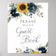 Sonnenblumen Blumenblauer Navy Blauer Grüne Hochzeit Gästebuch-Zeichen. Rustikale Hochzeitssignatur mit Blumenmuster.
