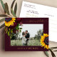 Große goldgelbe Sonnenblumen und rot bordeauxrote Rose Imitate goldfarbene Kalligraphie handschrift Stil und Rahmen machen ein modernes rustikales Foto Save the Date dunkelbordeauxrot Hochzeitspostkarte. ++++++++ Einfach mit Foto, Namen und Text auf beiden Seiten personalisieren! +++++++++++ Geeignet für moderne Blumensommer oder Herbst Herbst Garten Hinterhof rustikale Land, Böhmen oder Bauernhof themed Hochzeiten. ++++++++++ Die Farben sind veränderbar. Wenn Sie es in einer bestimmten Farbe anpassen möchten, wenden Sie sich bitte an den Designer über den unten stehenden Button "MESSAGE".