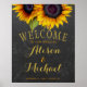 Elegante Hochzeit im Herbst stilvolle Willkommensplakatvorlage auf dunkelgrauem Chalkboard-Hintergrund mit großen gelben goldenen Sonnenblumen und einem extravagant bearbeitbaren Typografie-Skript. Füllen Sie Ihre Informationen in den Flecken, Sie können wählen, um es anzupassen, weitere sich ändernde Schriftartes und Farben der Schrift. — Es ist geeignet für elegante Sommer- oder Herbstferien rustikale Outdoor Hinterhofhochzeiten.