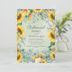 Elegante gelbe Sonnenblumen und schlängelgrüne Eukalyptusblumen verlasse individuelle Hochzeit Probe Dinner Einladung.