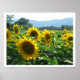 Foto eines Teils von Sonnenblumen vor einem Hintergrund von Bergen.