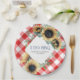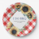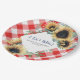 Rustikale personalisierte Papier Hochzeit Teller für Paare Dusche, Brautparty, Hochzeitsdusche auf dem Land oder I Do GRILLEN bieten einen Gingham Boarder mit Aquarellsonnenblumen und Grünpflanzen auf einem roten Tartan Schachbrett Muster. Personalisieren Sie mit Ihren Namen und Datum. Weitere Gingham-Printdesigns wie diese finden Sie unter www.zazzle.com/vginvites