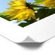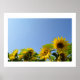 Gelbe Sonnenblumen trinken in der Sonne des Augusts. Ein Farbfoto, umgeben von einem weißen Rahmen, zum einfachen Einrahmen oder Aufhängen.