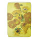 Sonnenblumen Vincent van Gogh. Stilles Leben auf einem gelben Hintergrund. Ein heller Blumenstrauß steht in einer Vase. Reproduktion berühmter Kunstbilder im öffentlichen Bereich.