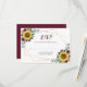 Diese RSVP-Karten zeichnen sich durch ein floralfarbenes Aquarellbild mit Sonnenblumen, bordeauxfarbenen Blume und einem geometrischen Rahmen mit vergoldeten Imitaten aus. Personalisieren Sie es mit Ihrem Datum. Diese Karten sind Teil einer Sammlung, die eine Reihe von passenden Hochzeitswaren und anderen Hochzeitsartikeln enthält. Bitte sehen Sie sich die Sammlungs-Seite an oder besuchen Sie unseren Shop, um das komplette Sortiment zu sehen.