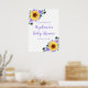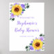 Dieses Babyduschposter mit modernen Aquarellfarben-Sonnenblumen, violetten Blumen und Eukalyptusblättern. Personalisieren Sie es mit einem Namen und Datum. Dieses Plakat ist Teil einer Kollektion mit einer kompletten Auswahl an Babyduschprodukten.