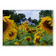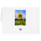 Ein Bauernhaus steht am Rande eines Feldes mit schönen Sonnenblumen. Auf der Rückseite der Karte befindet sich eine stehende Sonnenblume.