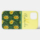 Dieses niedliche iPhone Gehäuse hat einen gelben Hintergrund oben mit Ihrem mit Monogramm Namen und dem Initial. Der Boden wird durch ein Band getrennt und ist ein Feld von schönen Sonnenblumen in grün, gelb und braun.