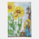 Original Aquarellmalerei von Sandra Gale mit einer Gruppe von Sonnenblumen und einer Gartentasche, Hut und Schaufel. Großartiges Design für Gärtner aller Art und ein perfektes Bild des Sommers!