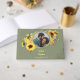 Mit einem Sonnenblumenmotiv mit zarten Goldfolienakzenten und Script-Schriftart vor dem Hintergrund von Sage Green. Personalisieren Sie mit Ihrem Lieblings-Foto für einen besonderen, einzigartigen Sake für Ihre Hochzeit.