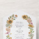 Vereinfachen Sie Ihr Hochzeitsgeschenk, ohne den Stil zu opfern, mit dieser All-in-One-Sende-and-Siegel-Hochzeitseinladung. Mit einem atemberaubenden, handbemalten Bouquet mit goldgelben Sonnenblumen, sanften rosa und staubblauen Wildblumen und weißen Gängen vereint dieses Design das Wesen rustikaler Eleganz und wahnsinnig bohischen Charme. Die Vorderseite öffnet sich, um Ihre vollen Einladungsdetails zusammen mit einer abnehmbaren UAWG-Postkarte zu verraten, sodass die Gäste leicht antworten können und alles wunderschön koordiniert behalten wird. Mit einem knusprigen, weißen Hintergrund, um die zarten Aquarellblumen hervorzuheben, ist dieses Design perfekt für Frühling, Sommer oder Hochzeiten im Herbst. Machen Sie jedes Detail mühelos und schön - passen Sie Ihre Sende- und Siegel-Einladung noch heute an.