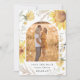 Set die Szene mit dieser atemberaubenden Sonnenblume Blumen Hochzeit Speichern Sie die Date-Karte. Mit einem Foto, gerahmt mit wunderschönen gelben Sonnenblumen im Wasser und bohem Set aus Wiesenblättern auf klassischem weißem Hintergrund.
