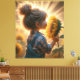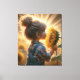 Kleines Mädchen mit leuchtender Sonnenblume auf einem Sommerfeld mit Sonnenliegen