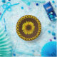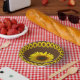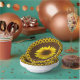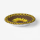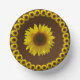 Papierschalen mit Sonnenblumenbild vor braunem Hintergrund.