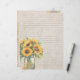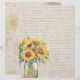 Scrapbook-Papier mit Leinendesign und Sonnenblumen. Größe 21,59 x 27,94 cm (2 kleinere Größenoptionen) mit Designs auf beiden Seiten und Linien auf einer Seite. Ein mit Sonnenblumen gefülltes Glas ziert die Seite mit Linien. Ein Hintergrundmuster aus Sonnenblumen bedeckt die andere Seite. Das Papier hat eine rustikale, leinenartige Textur, ist aber kein Leinen.