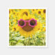 Rosa Sonnenbrille auf Sonnenblumen in einem Sonnenblumenfeld.