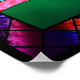 Ein digitales Buntglasdesign im Art-Déco-Stil, das im 20. Jahrhundert beliebt war. Das weithin verwendete Sonnenburstmotiv ist zentral und erhebt sich hinter einer grünen Landschaft, die von einem Baum auf der einen Seite und Wolken und Blume auf der anderen Seite ausgeglichen wird. Geometrische Formen werden verwendet, um die Symmetrie der Szene zu betonen, wobei der Baum und die Wolken aus überlappenden Kreisen bestehen. Verschiedene farbenfrohe Fraktal verleihen der "gläsernen" Textur und dem Interesse. Die Szene ist gerahmt in schwarzen Eisenarbeiten und diamantförmigen Blöcken, mattiert mit dunklen, aber lebendigen Fraktal-Mustern.